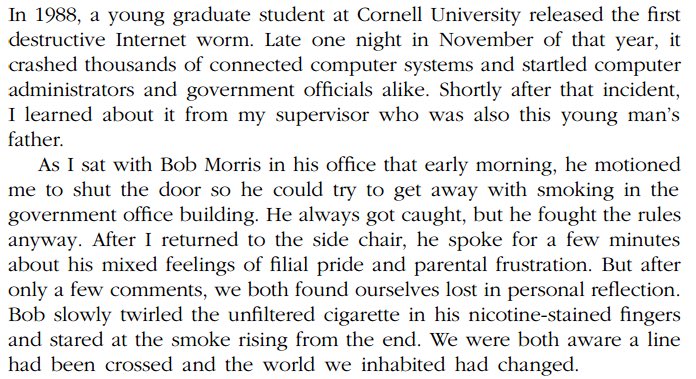 Book excerpt: "In 1988, a young graduate student at Cornell University released the first destructive Internet worm. Late one night in November of that year, it crashed thousands of connected computer systems and startled computer administrators and government officials alike."🧵