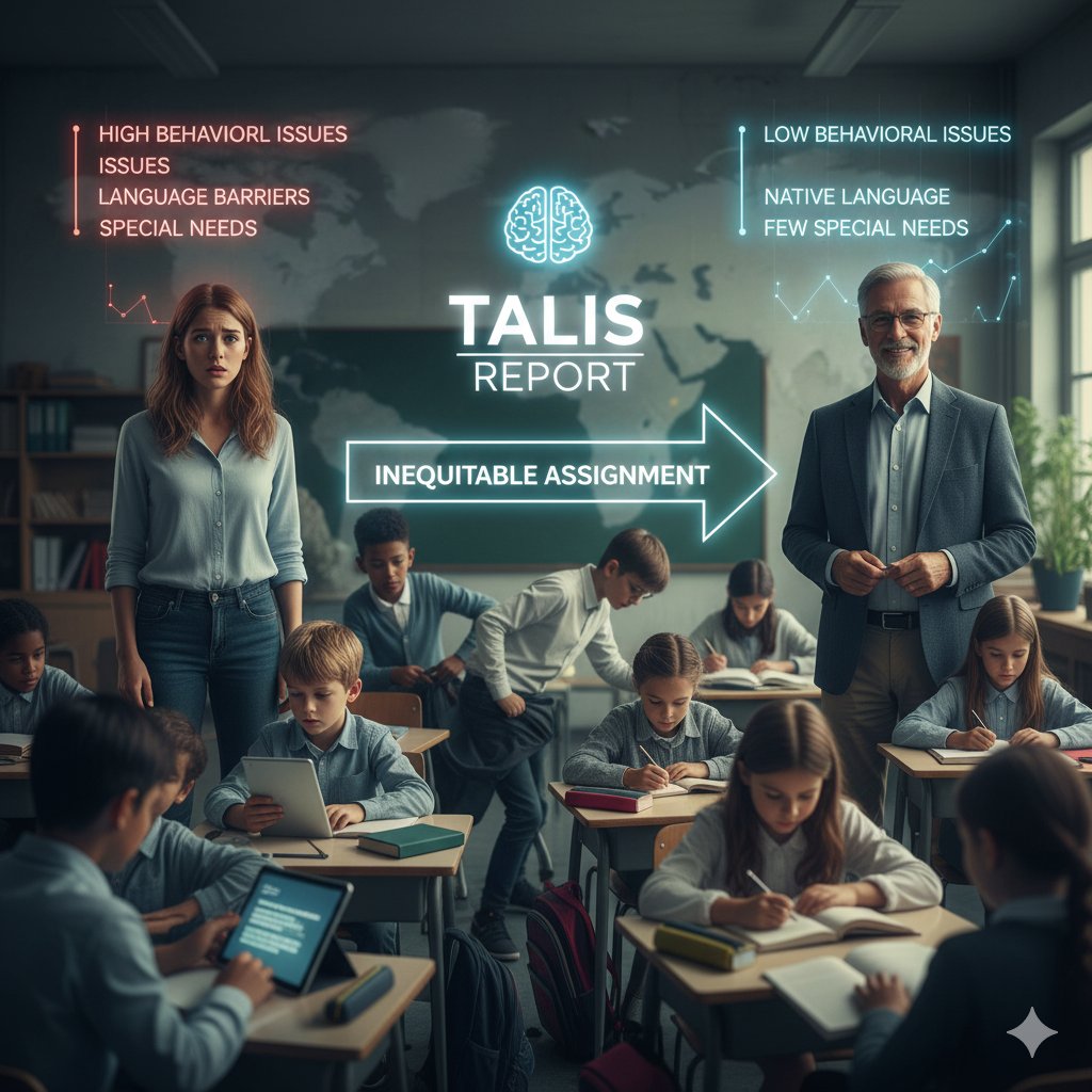 Tras la lectura y análisis del informe TALIS (2024), me quiero centrar en un aspecto que considero nuclear: la asignación de aulas al profesorado novato. Este grupo es, a menudo, asignado a los entornos educativos más difíciles, lo que refleja un problema de serie importante. ▶️