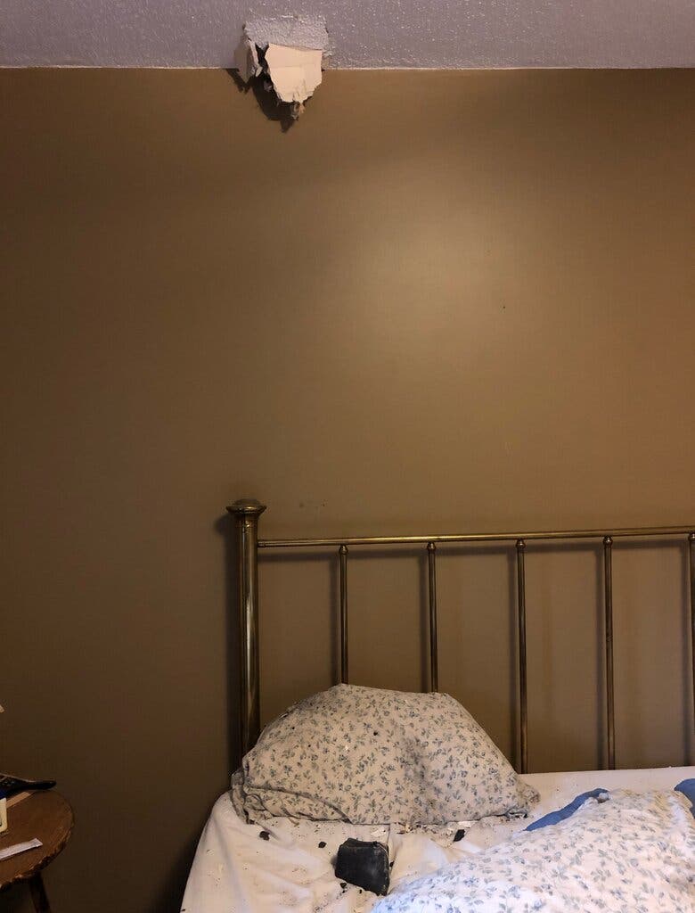 Na noite de 3 de outubro quando foi acordada por um estrondo explosivo, quando algo despencou do telhado e a despejou de escombros, disse Hamilton.