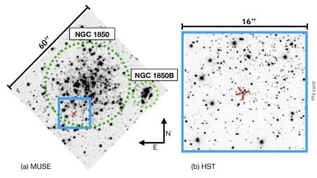 Pelo instrumento MUSE, instalado no Telescópio Very Large Telescope (VLT), no Chile. O buraco negro recentemente descoberto foi achado no aglomerado de milhares de estrelas NGC 1850, a cerca de 160 mil anos-luz, dentro da Grande Nuvem de Magalhães.
