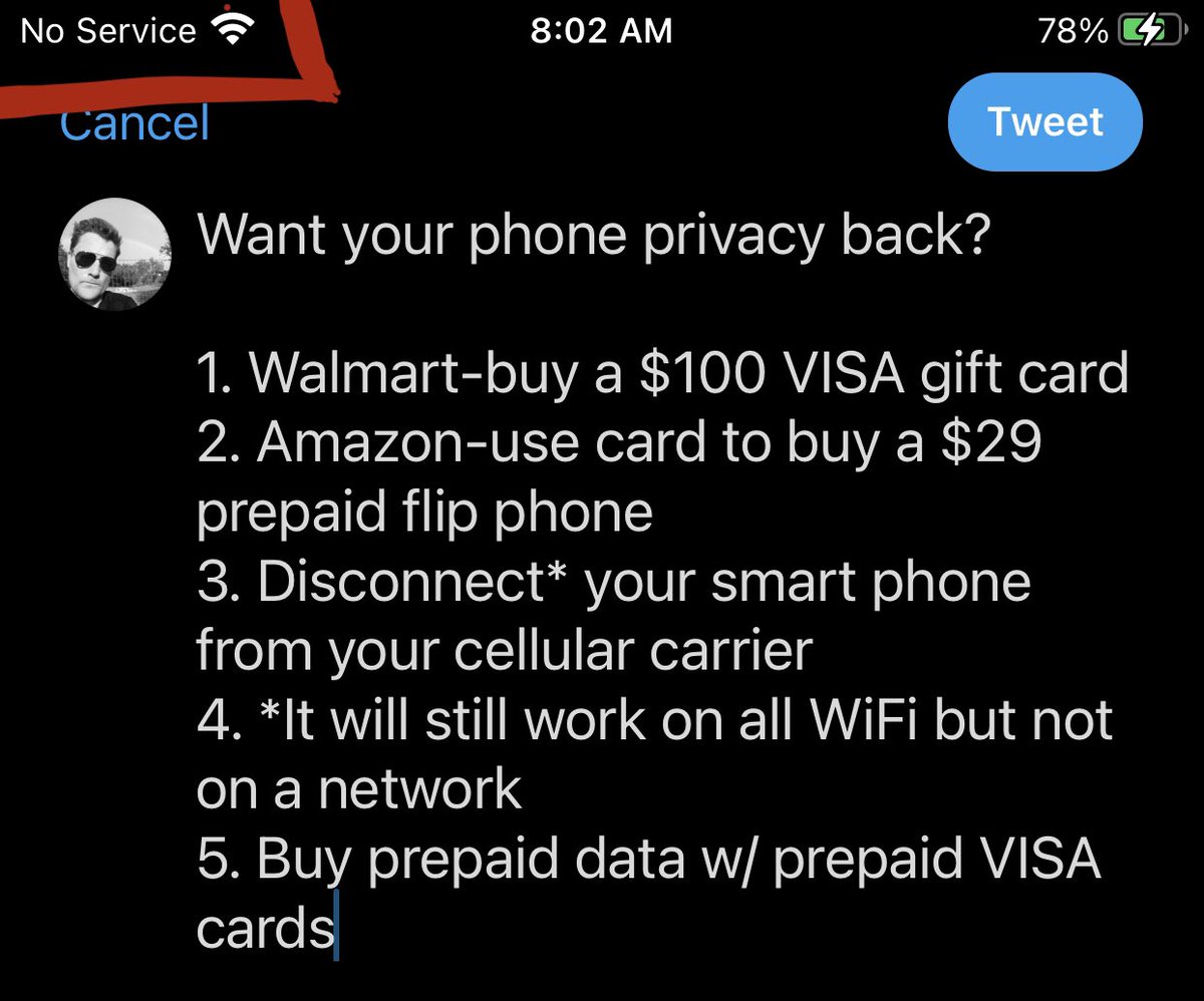 1. Walmart-buy a $100 VISA gift card 2. Amazon-use card to buy a $29 prepaid flip phone 3. Disconnect* your smart phone from your cellular carrier 4. *It will still work on all WiFi but not on a network 5. Buy prepaid data w/ prepaid VISA cards