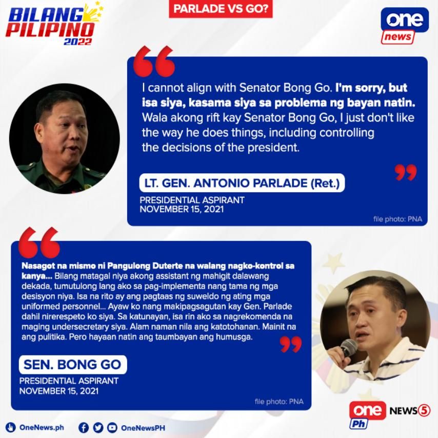 The surprising news of the day came from Antonio Parlade, who substituted for Butch Valdes as Presidential candidate of the Katipunan ng Demokratikong Pilipino. Parlade claimed that he didn't run under the administration party because of his "differences" with Sen. Bong Go.