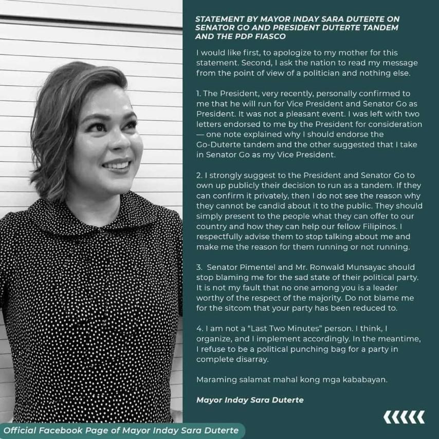 I don't think the President ever wanted it to be a Duterte-Go tandem to begin with. He had been open about his not being inclined to let Daughterte run for President as it is a thankless job based on his experience. Sara would never admit to an open feud with the Davao Origs.