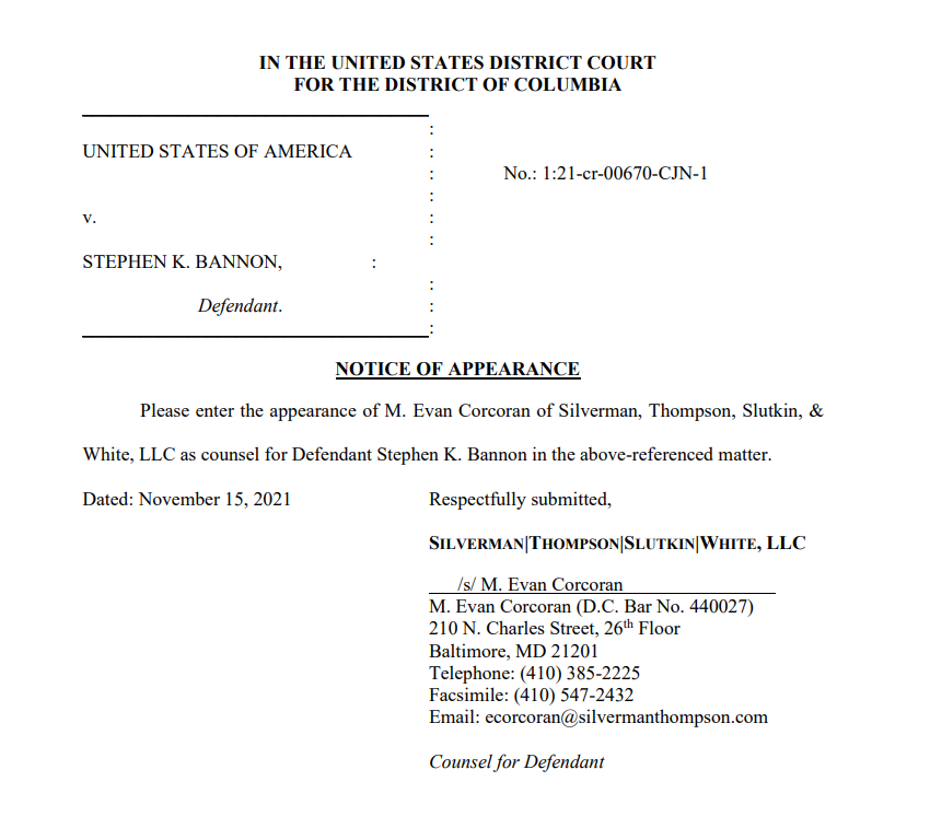 Stephen Bannon, now facing 2 counts of contempt of Congress, has hired former Trump impeachment attorney David Schoen and former AUSA Evan Corcoran to defend him. Corcoran is one of the Silverman Thompson attorneys representing Capitol Police Officer Angelo Riley. #CapitolRiot