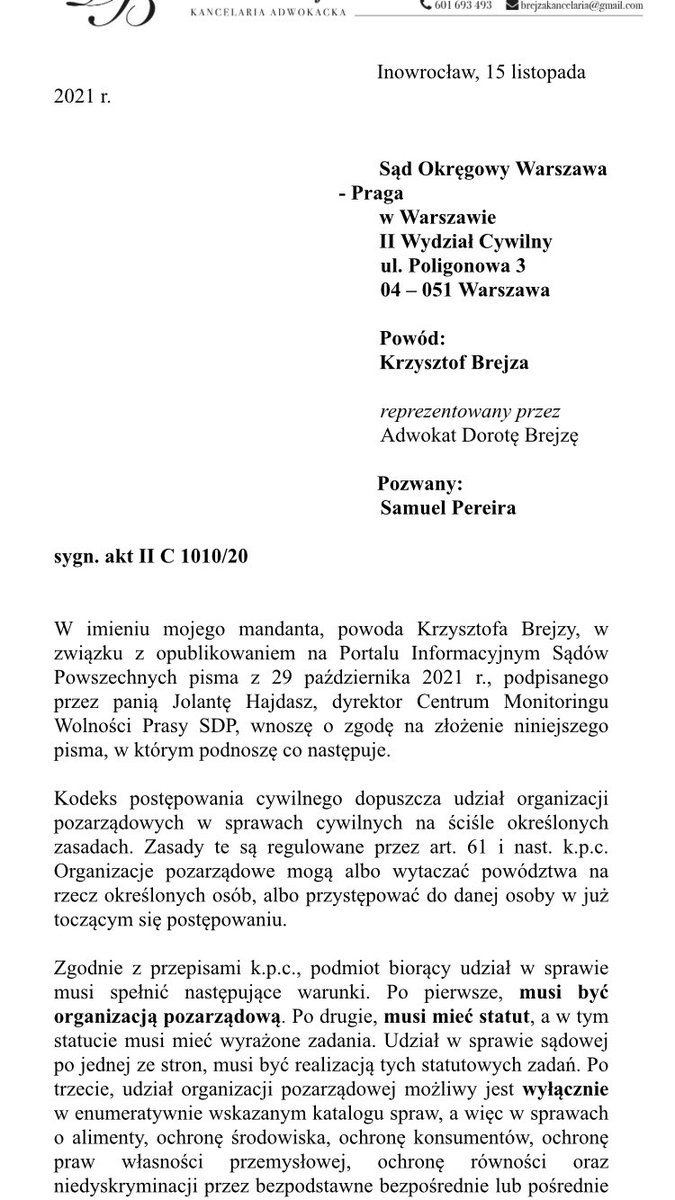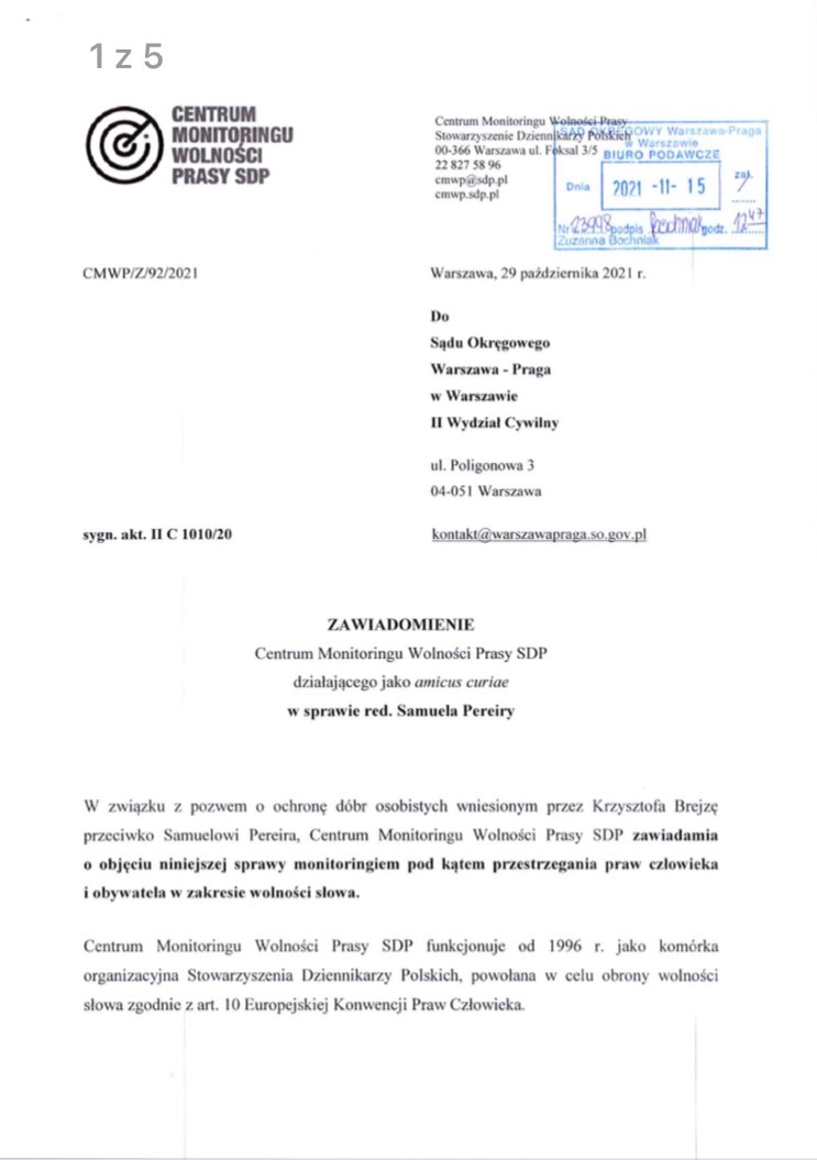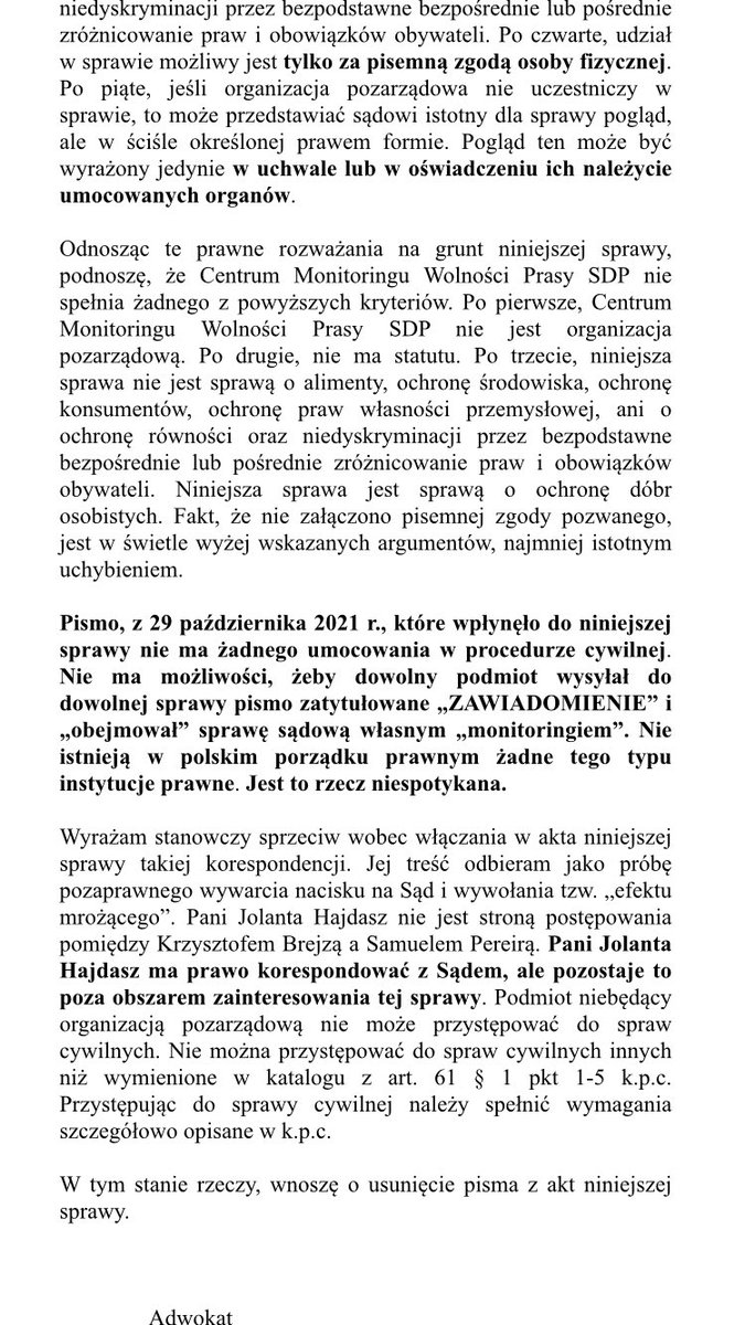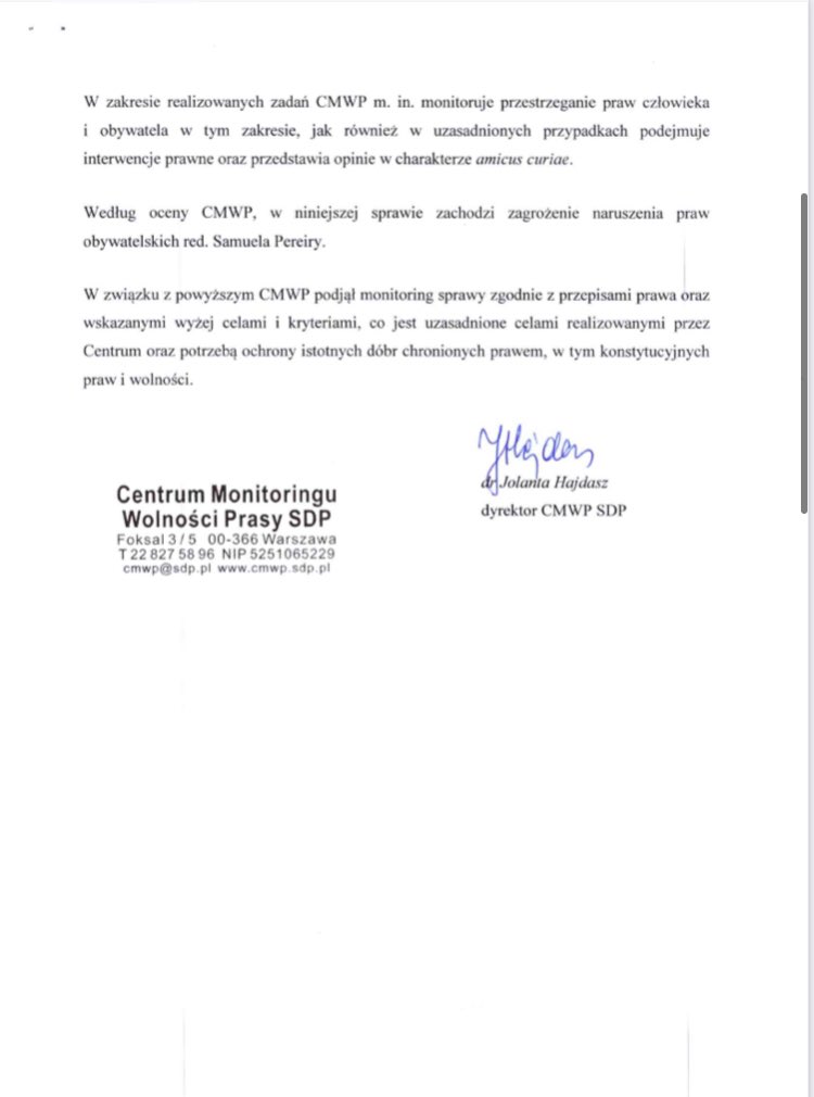 „Centrum Monitoringu Wolności Prasy”to jakaś struktura wewnątrz pisowskiego SDP. Nie ma żadnych uprawnień do wstępowania do takich postępowań jak niniejsze. Fakt obecności tego pisma w aktach tej sprawy jest zdumiewający. Jest to zupełnie pozaprawna proba wywołania nacisku na sąd