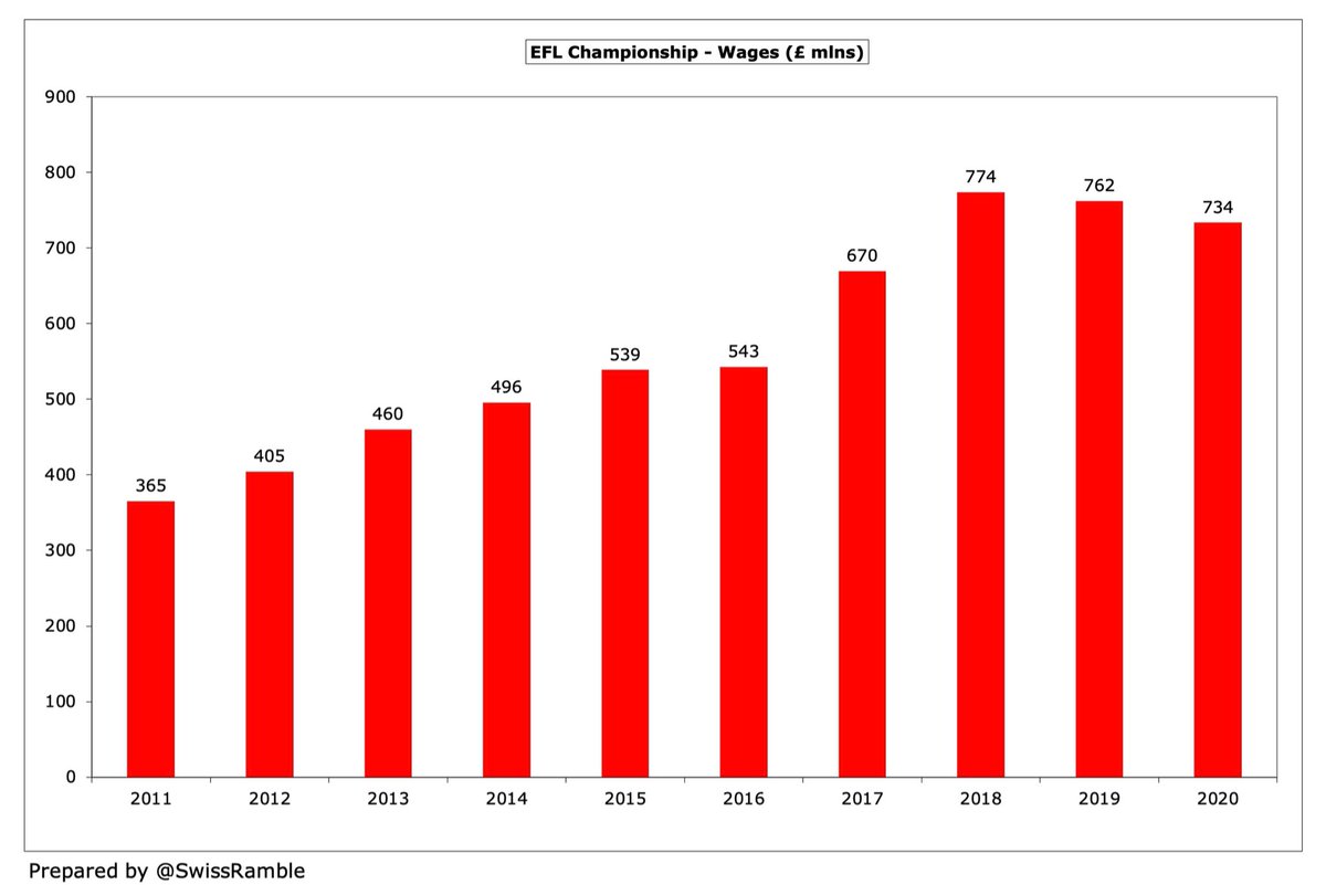 Championship wages fell £28m (4%) in 2020 from £762m to £734m, though have still more than doubled from £365m in 2011 (and up nearly £200m from £543m in 2016). Worth noting that 2002 also excludes wages from #DCFC and #WAFC, as no accounts published.