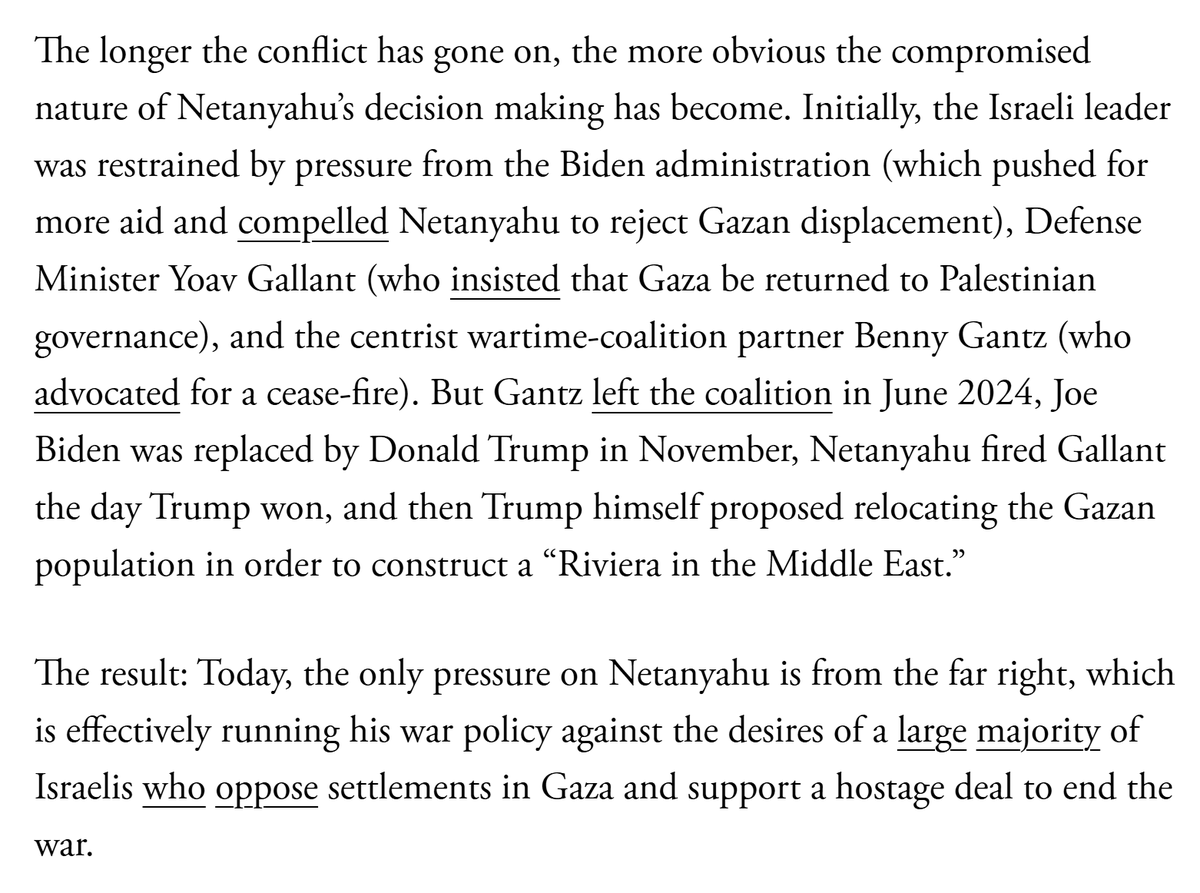 Israel's far right wants to conquer and settle Gaza, expelling any Palestinians in the way. Benjamin Netanyahu wants to stay in power. I wrote about the corrupt political bargain that is prolonging Gaza's war and driving its hunger crisis. Gift link below.