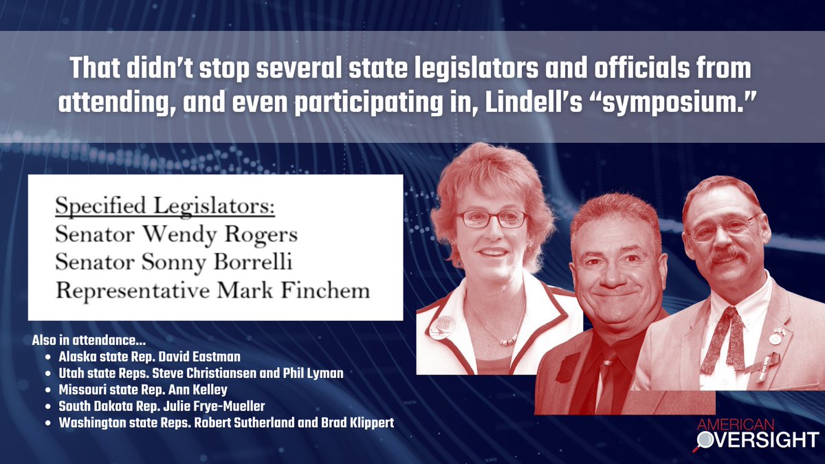 That didn’t stop several state legislators and officials from attending, and even participating in, Lindell’s “symposium.” For example, Arizona state Sen. Wendy Rogers, state Sen. Sonny Borrelli, and state Rep. Mark Finchem spoke on a panel. pinalcentral.com/maricopa_monit…