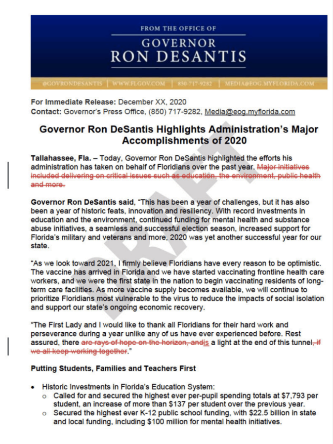 New: Last December, Florida Gov. Ron DeSantis’s team drafted a press release highlighting his 2020 accomplishments. The edits to the document we obtained show his team deleted mentions of Covid-19 safety measures, including encouraging people to wear masks.