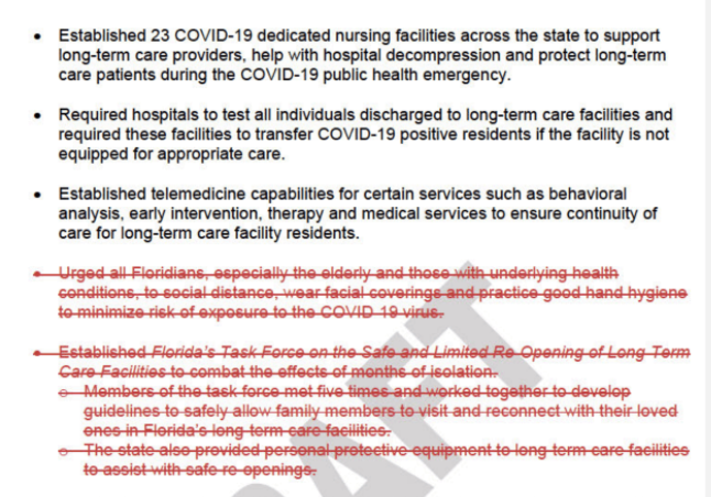 His team also deleted mention of Covid-19 prevention measures: “Urged all Floridians, especially the elderly and those with underlying health conditions, to social distance, wear facial coverings and practice good hand hygiene to minimize risk of exposure to the Covid-19 virus.”