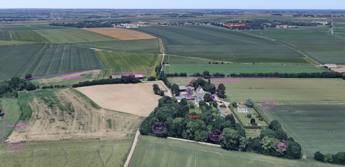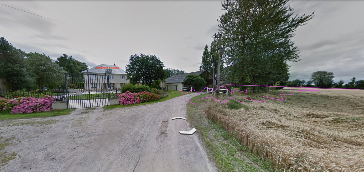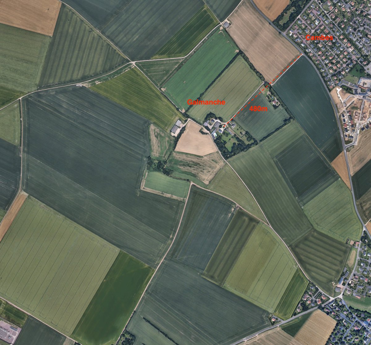This recent google satellite view shows the area around Galmanche has not really changed. Field boundaries have changed and hedgerows gone in some places. To the north, it is 480 meters of open ground to the edge of Cambes Village.