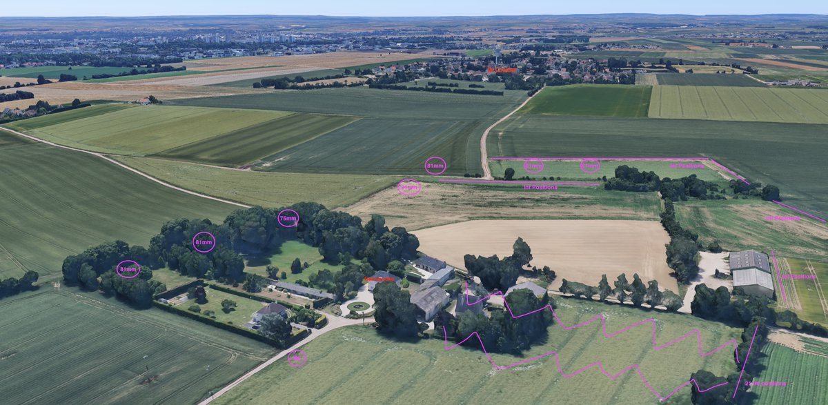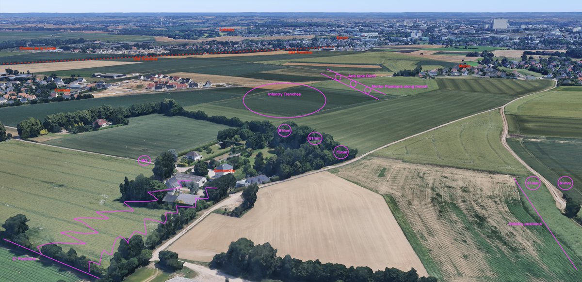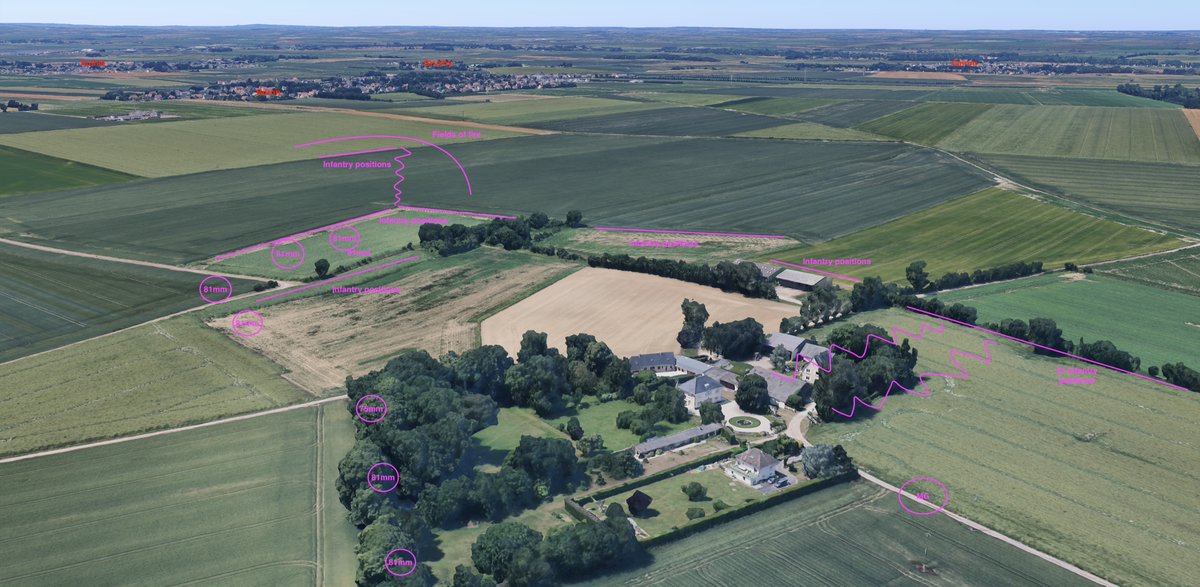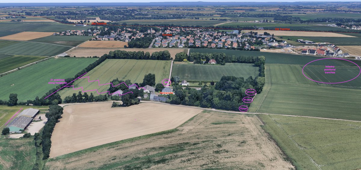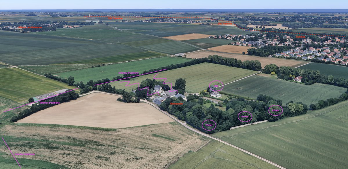 Lets start to look at the landscape. The German positions are marked in purple, I have not marked the British positions. This will be covered in another thread. This is the view north towards Cambes. Note the MG positions at the front of the Chateau with good fields of fire.