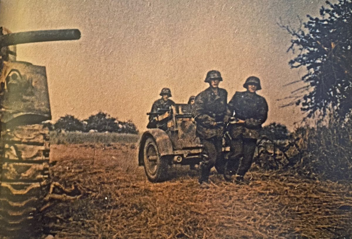 A gun crew with trailer and ammunition, possibly for the 75mm PAK Gun. This was taken weeks earlier in Cambes after knocking out tanks of 1ERY. These weapons taken back from Cambes now hidden around Galmanche. Photo- Panzerdivision Hitlerjugend Volume II, Stephen Cazenave