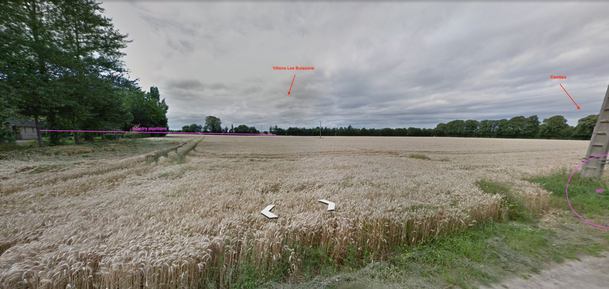 This is a view from the east looking back towards Galmanche. British Infantry should have passed through this area, the 2/5 Lancashire Fusiliers, but were pinned down prior to clearing the east of Cambes. Vast open ground, covered by mortars, 75mm, MG's and rifles.