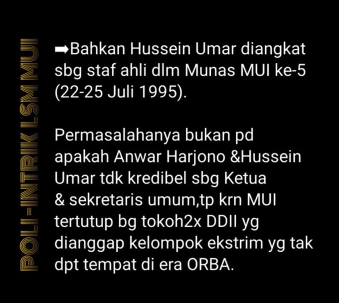 8. PERUBAHAN ORIENTASI POLITIK SOEHARTO | memiliki konsekuensi pd perubahan di internal MUI. Kepengurusan MUI periode 1995 - 2000 mulai diisi tokoh2x penting DDII, termasuk Anwar Harjono & Hussein Umar sbg Ketua & Sekretaris Umum.