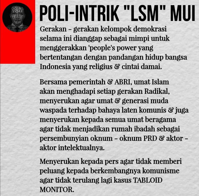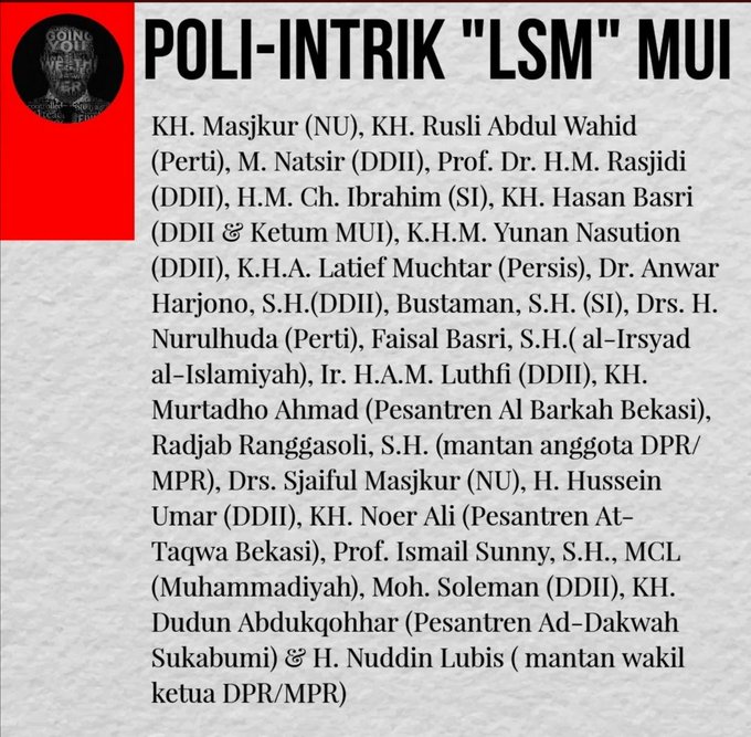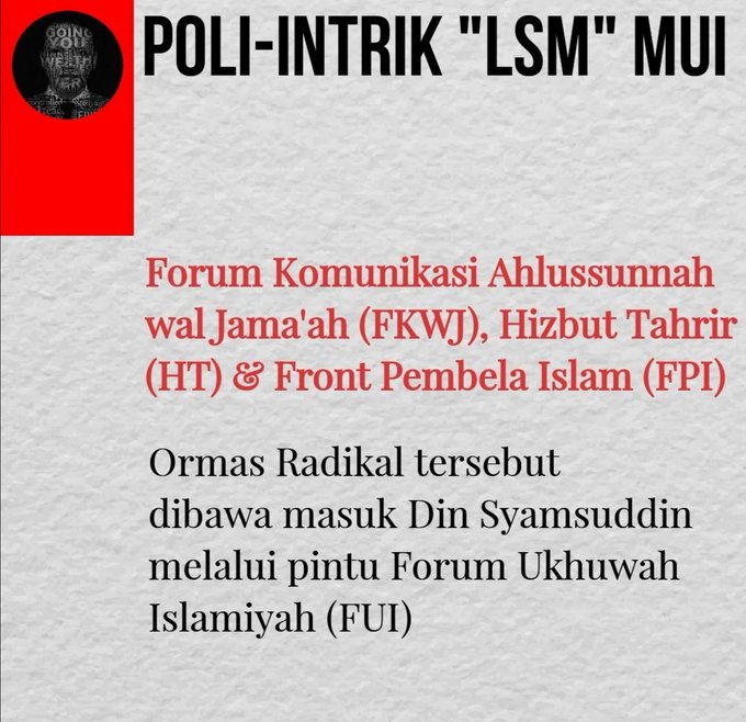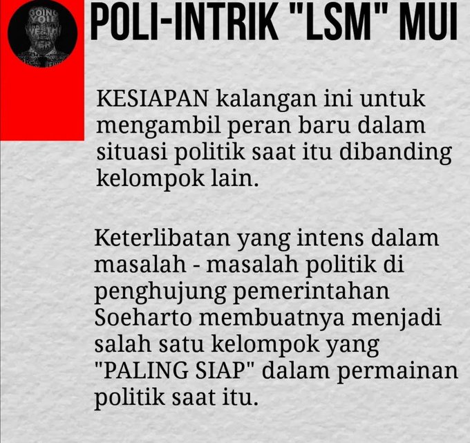 Transformasi MUI dari Instrumen negara di era ORBA yg pasca tumbangnya SOEHARTO dimanfaatkan kelompok Radikal Konservatif dlm menginstitusionalisasi nilai² keagamaan sbg agenda politik KELOMPOK TERTENTU utk ISLAMISASI INDONESIA.