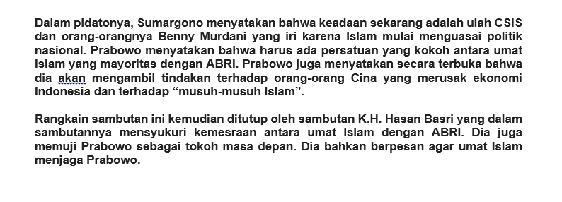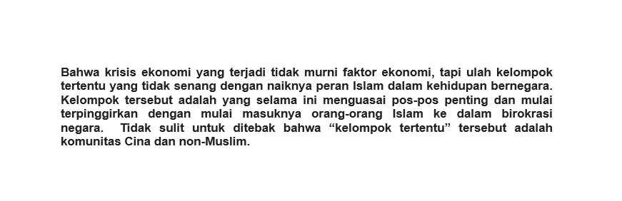 14. Pesan yg hendak disampaikan dlm acara tsb adalah bhw krisis ekonomi Indonesia saat itu merupakan ulah para konglomerat Cina non-Muslim yg didukung oleh kekuatan Barat dan Cina perantauan, yg tidak senang dengan perubahan politik nasional yang mulai berpihak ke Islam.