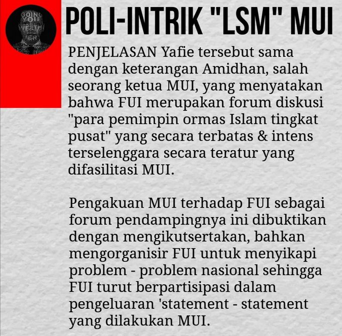 22. Penjelasan tsb di atas menunjukkan bahwa FUI memiliki pengaruh yg sangat kuat terhadap MUI di saat reformasi.
