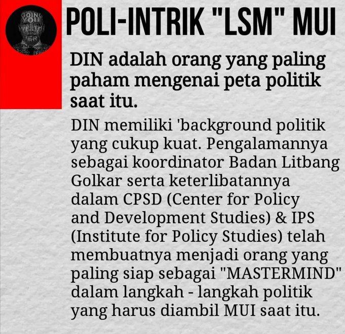 Hal yg sama juga bs digunakan untuk menjelaskan mengapa DIN SYAMSUDDIN memiliki peran penting dalam membawa masuk kelompok radikal ke dalam MUI. Dibanding dengan figur² lain di dalam MUI.