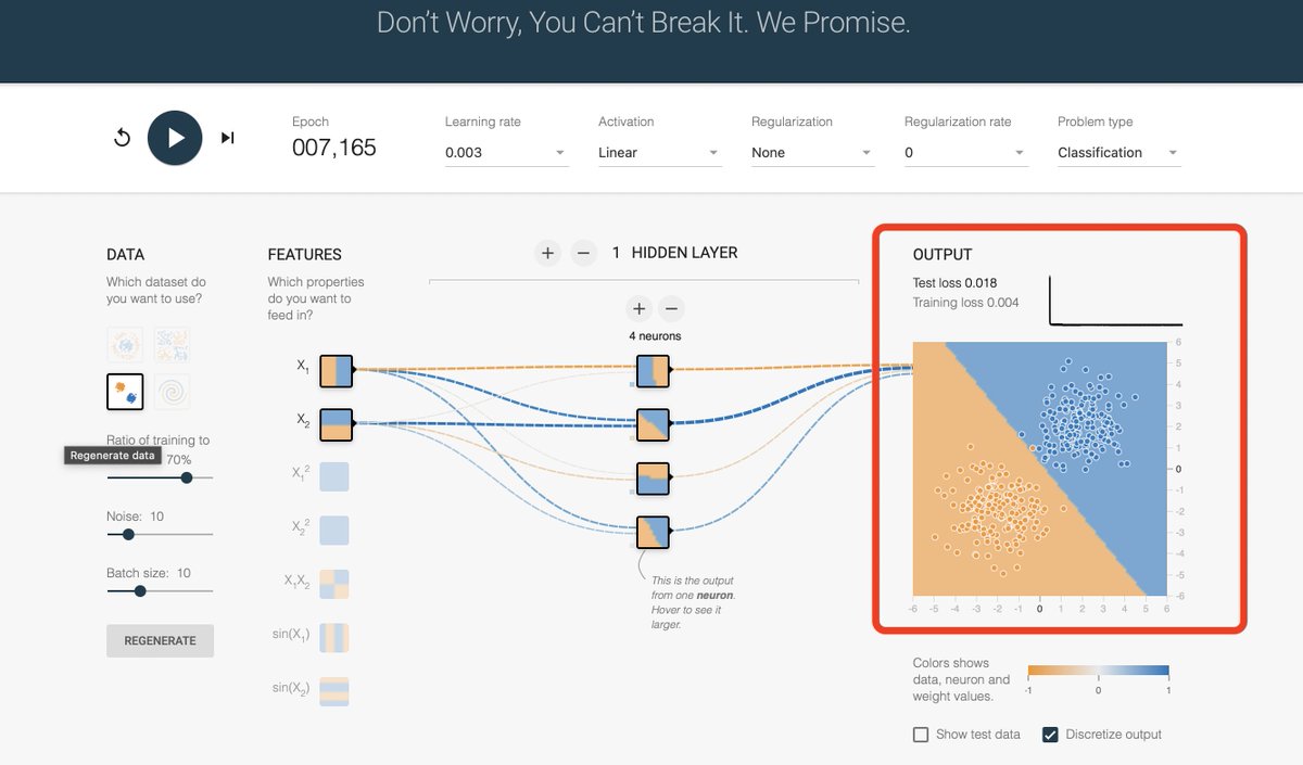 Take a loot at the configuration in the image or trying running it yourself: Similar input data as we have above (with little bit of noise), no non-linear activation function.
