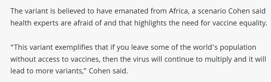 Segundo alguns especialistas, acredita-se que a variante seja emergente da África, e destacam a relevância da equidade da distribuição de vacinas, pelo risco que podemos estar vendo variantes surgirem em locais de baixa cobertura vacinal jpost.com/health-and-wel…