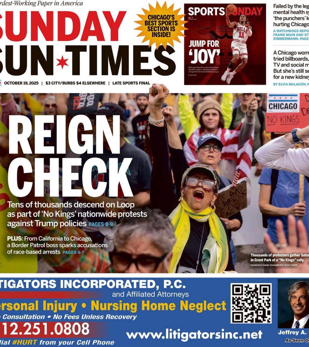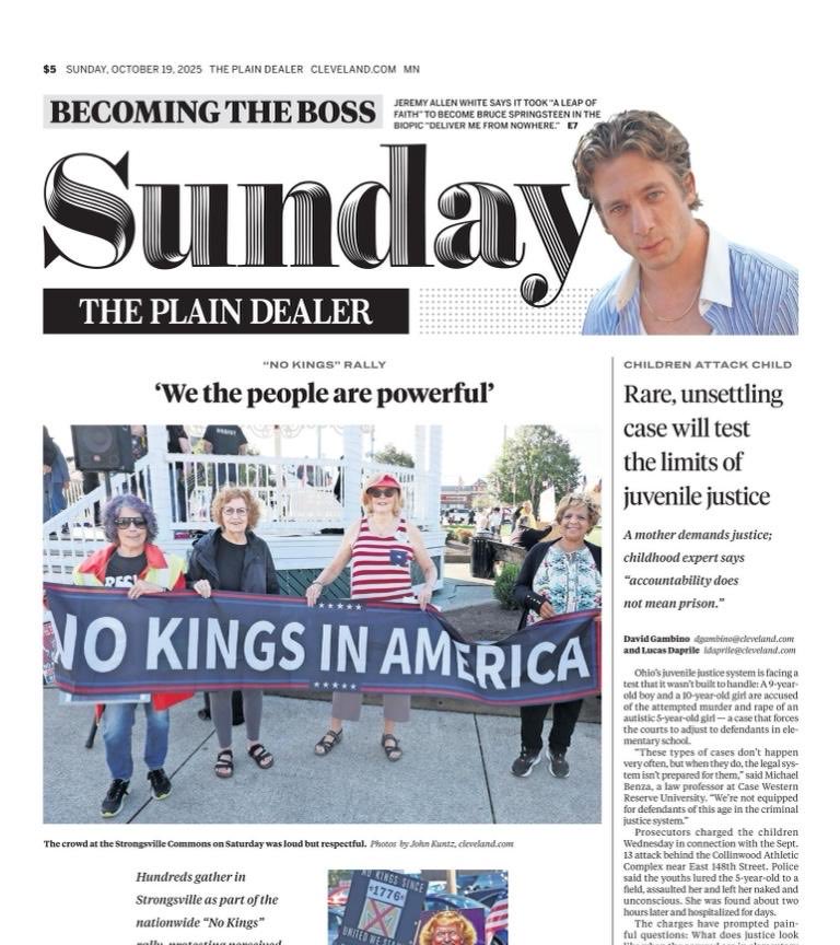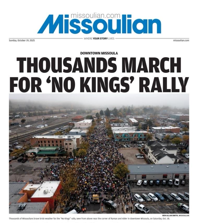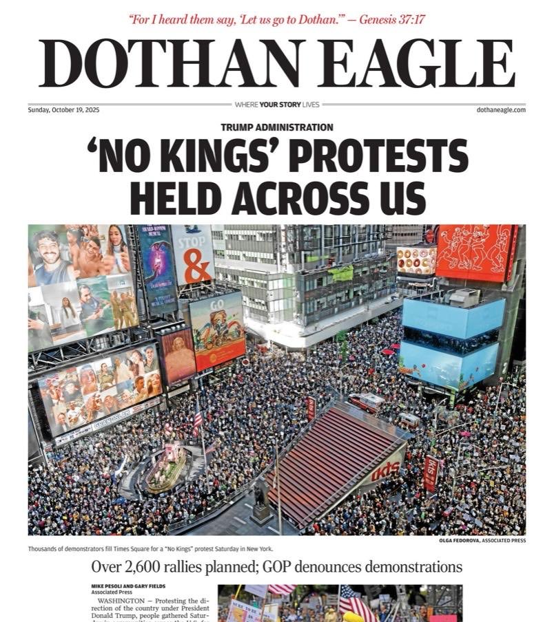 Saturday’s “No Kings” protests have filled front pages across America with impactful visuals and headlines of peaceful protests. Many included the eye popping NYC Times Square shot. Here in the Dothan Eagle (Alabama). But everyone turned out. See Montana in its Missoulian. /1