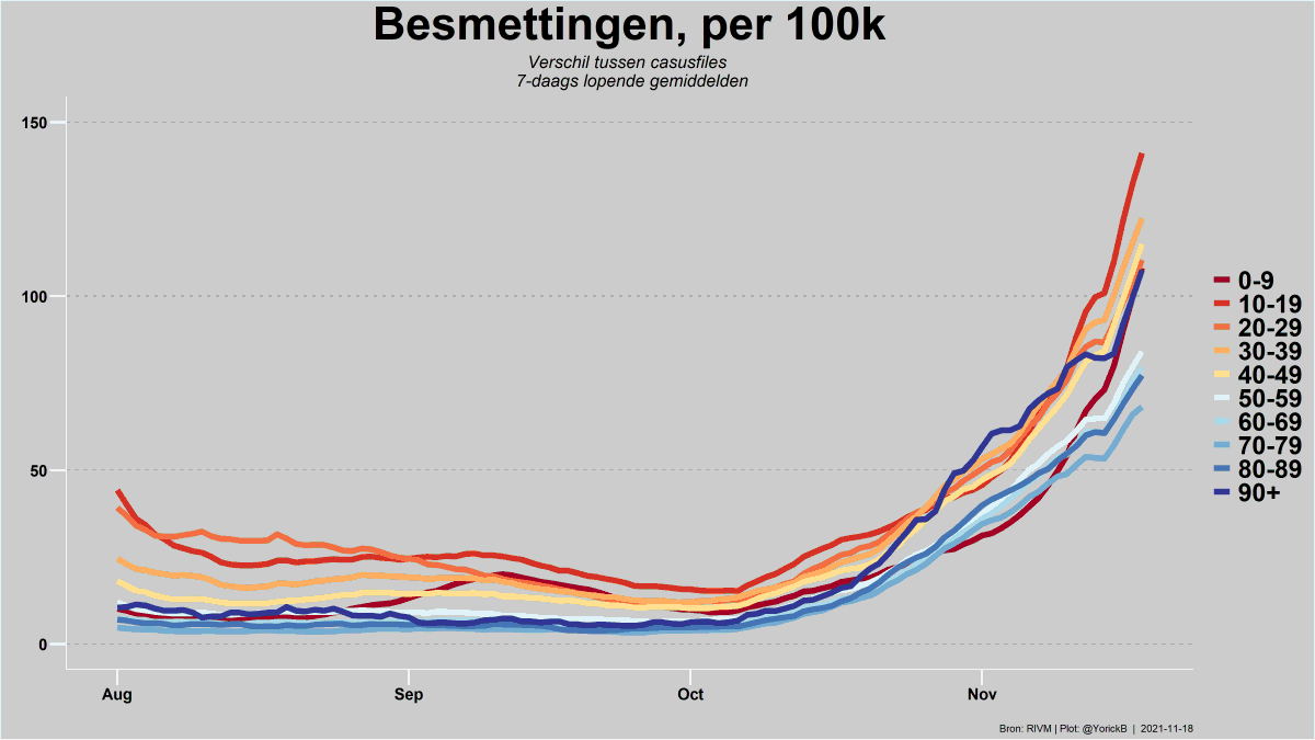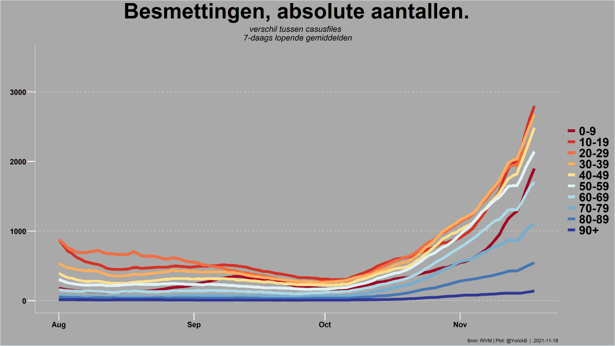 Aantal besmettingen binnen de leeftijdsgroepen.