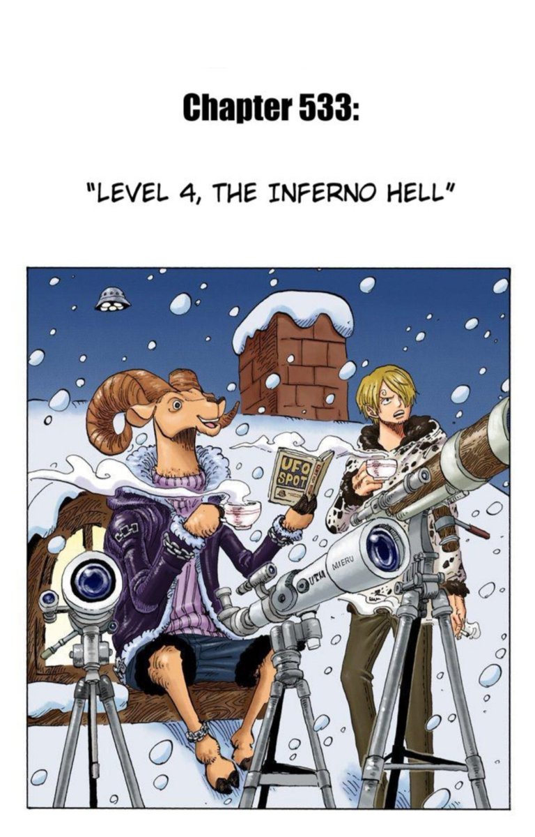 In Chapter 533 the title of the chapter is "Level 4 Inferno Hell" on the cover we see Sanji and a Goat looking for UFOs in the sky. An impel down chapter with "Inferno Hell" as a title.. Fitting.