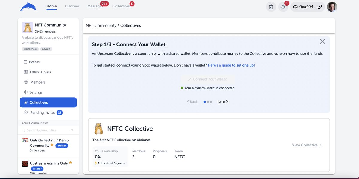 Upstream Collectives members can contribute money into the community’s shared ETH wallet, write proposals for how the money should be used, and vote on all the decisions made by the community.