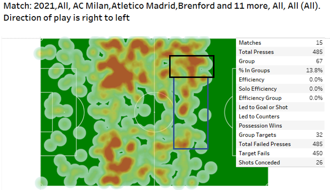 This is the combined heatmap from the 2018 and 2019 seasons (all comps) showing pressing FAILS. A failed press is when the presser either gives away a free kick or is directly bypassed with a dribble or vertical pass.