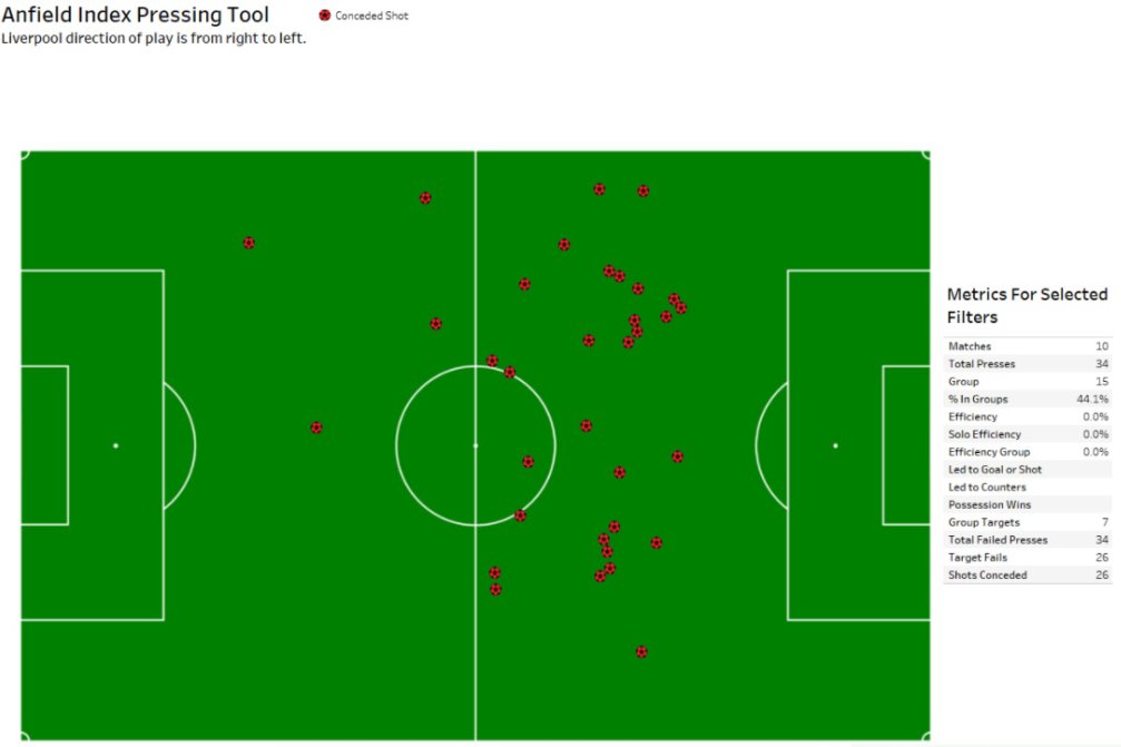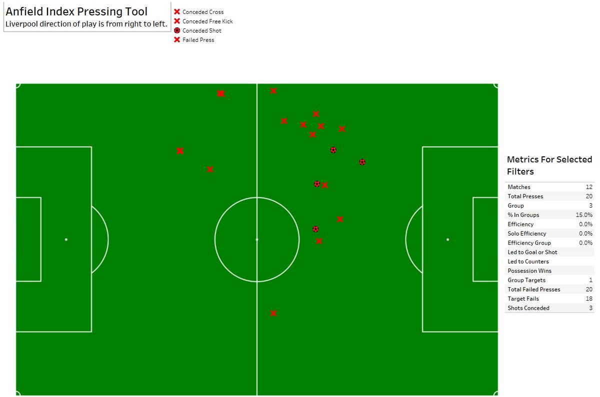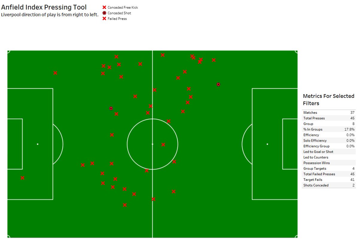 This is putting more pressure on the back 4 who are in turn being too aggressive and giving up a lot of chances to the opposition. Joel Matip already has 39 presses with 14 fails from centre back this season, a frankly ridiculous number.