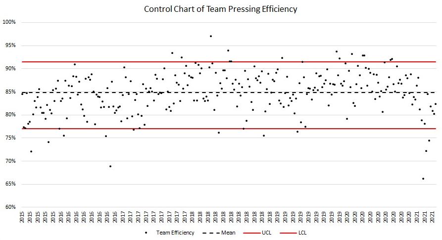 One final chart for the stattos. This is the team level pressing efficiency for every match we've collected under Klopp. This is one reason why we say 21/22 is looking like 16/17.