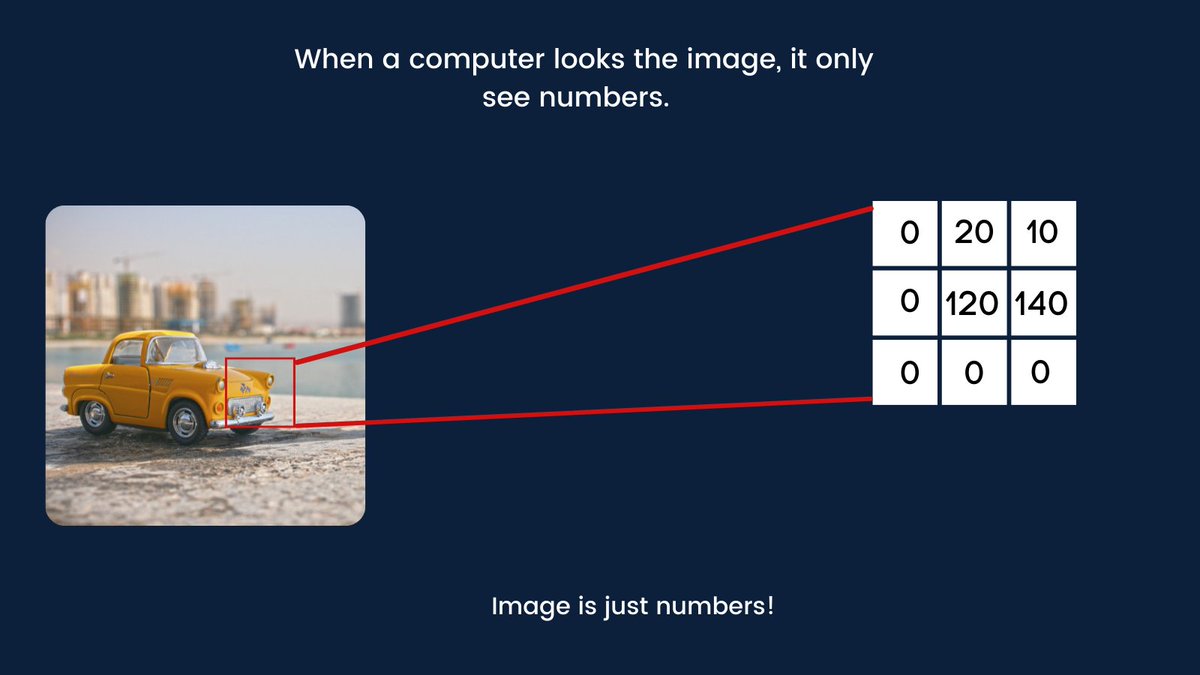 Computers only understand numbers. When you look at a car, you know it's a car. When you feed a car image to a computer, it only sees numbers or pixel values.