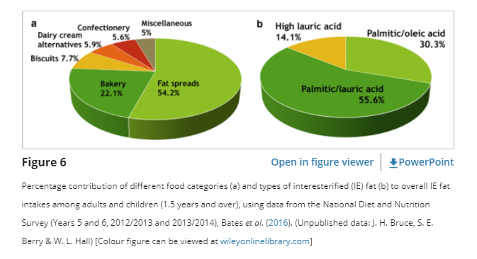 Some more on interesterified fats. Fat spreads, baked goods, and biscuits (cookies) are the largest sources.