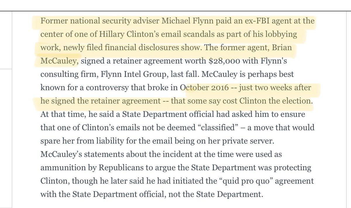 Flynn paid former FBI agent Brian McCauley $28,000 and two weeks later McCauley lied about Hillary’s emails which was used to reopen the case against her — arguably costing her the election.