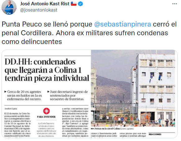 Kast se ha destacado por ponerse del lado de los criminales y violadores de DDHH de Punta Peuco. "Conozco a Miguel Krassnoff y viéndolo no creo todas las cosas que se dicen de él", dijo sobre quien tiene una condena de más de 840 años de cárcel.