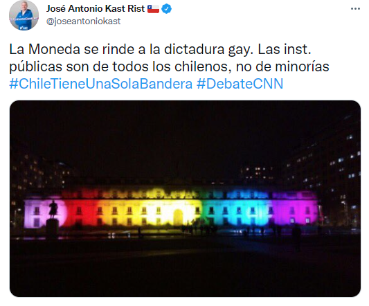 Kast se ha opuesto a todos los avances LGBTIQ+, promueve caricaturas como la "dictadura gay" y teorías conspirativas como la "ideología de género", además de atacar la identidad de género de Daniela Vega e Ignacia Livingstone.