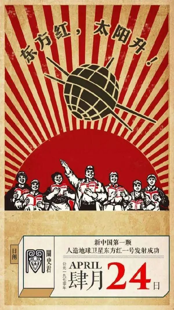 Peluncuran satelit Dongfanghong I, dgn roket CZ-1, di spaceport Jiuquan, 24 April 1970. Foto roket yg siap meluncur, dan poster event yg sesuai dgn zeitgeist jaman itu di China.