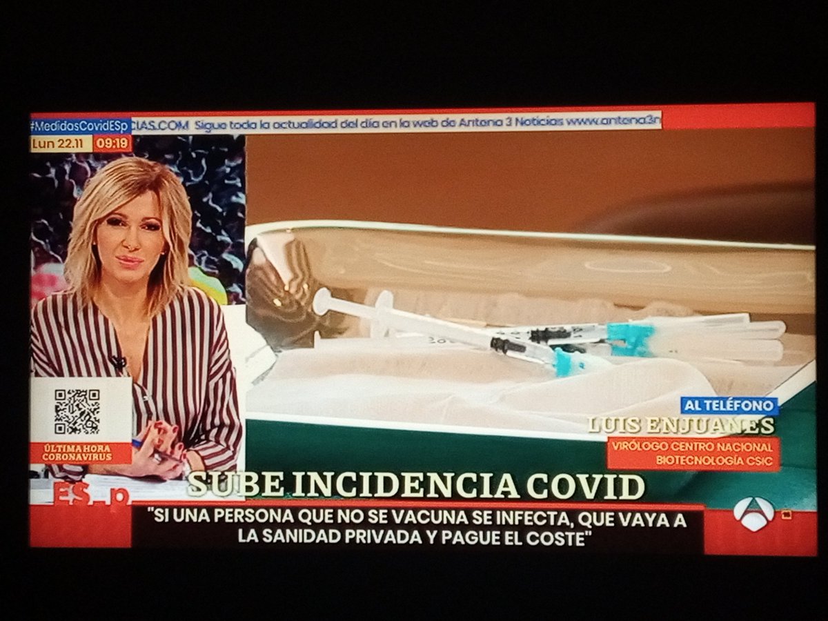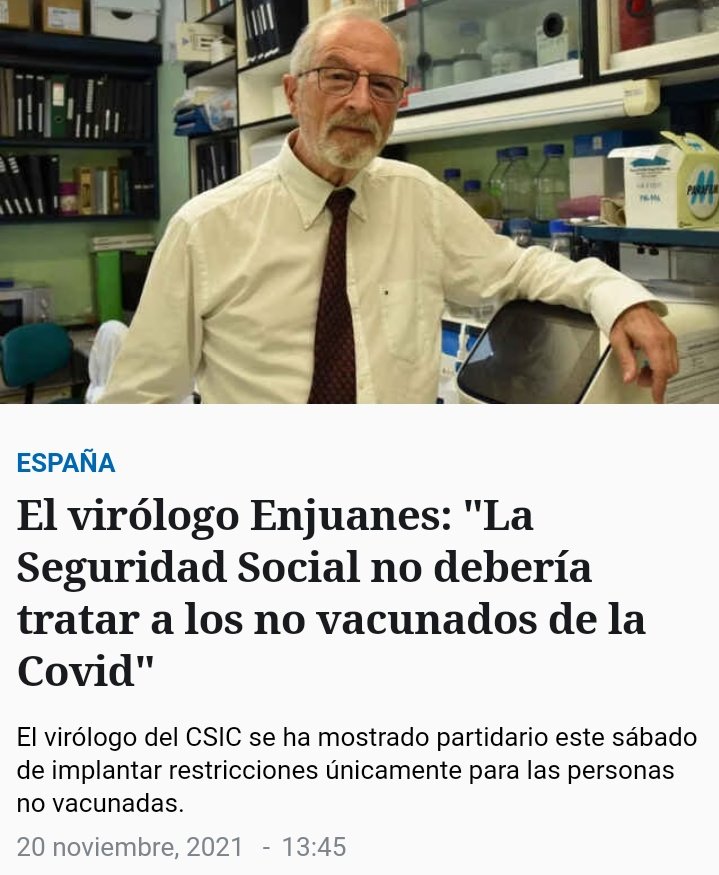 Luis Enjuanes anda diciendo en todos los Medios que no se debe atender en la Seguridad Social a los No Vacunados, criminales a segregar; porque deben asumir las responsabilidades de sus actos.