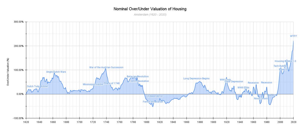 6/ What are the lessons of history? If we define a bubble as a period with >25 per cent overvaluation, then Amsterdam has had five bubbles since 1620: