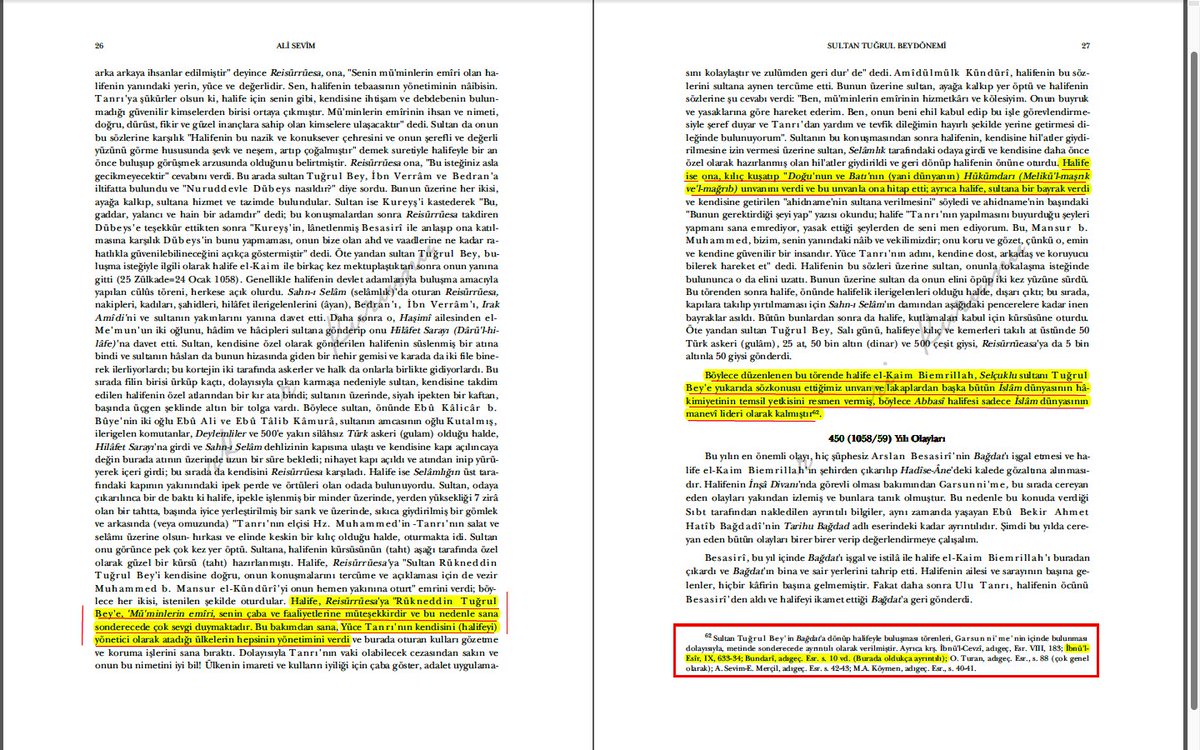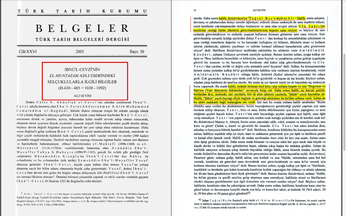 2️⃣1050'lerde Tuğrul Bey döneminde hilafetle saltanatın ayrıldığı, halifenin devlet yönetiminden soyutlandığı bilgisi, ilk olarak olaya tanık olan birincil kaynaklar, Garsun'ni'me ve 1100'lerde Arap Vakanüvis İbnü'l Cevzi'nin kitaplarında yer almıştır.