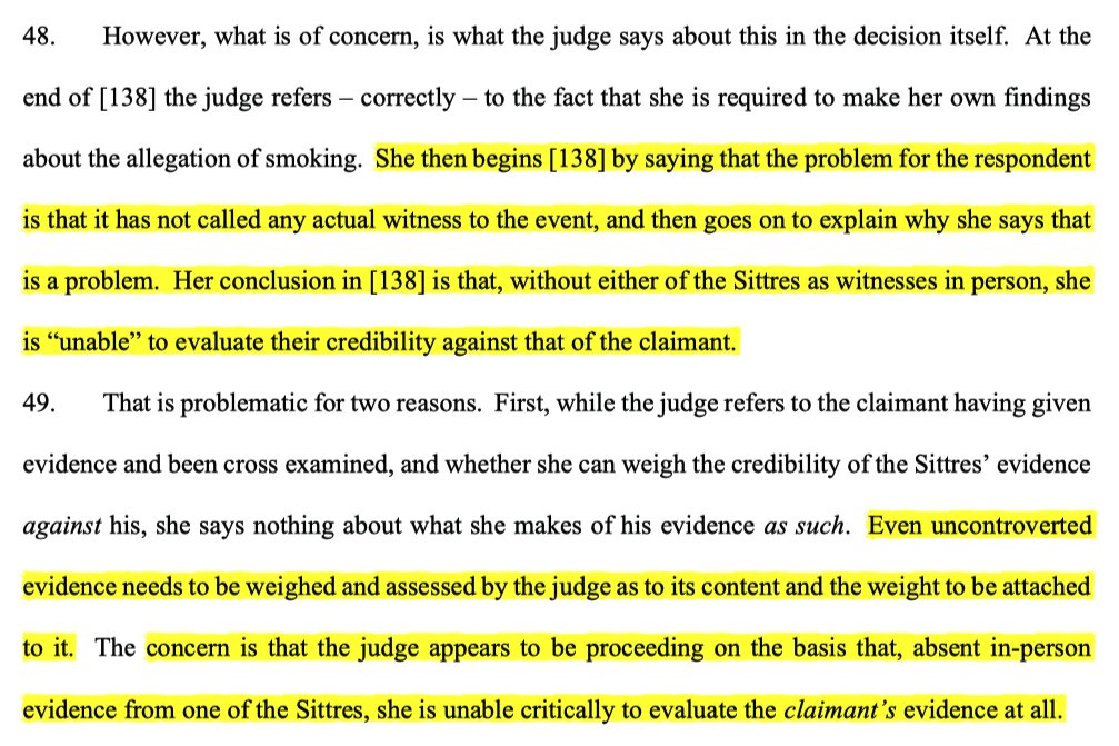 9/ As the EAT noted, the EJ appeared to proceed on the basis that she couldn't even critically evaluate the credibility of L's denial of smoking in the absence of witness evidence from the relevant people at Hovis, nor did the EJ think she could evaluate their evidence absent XX.