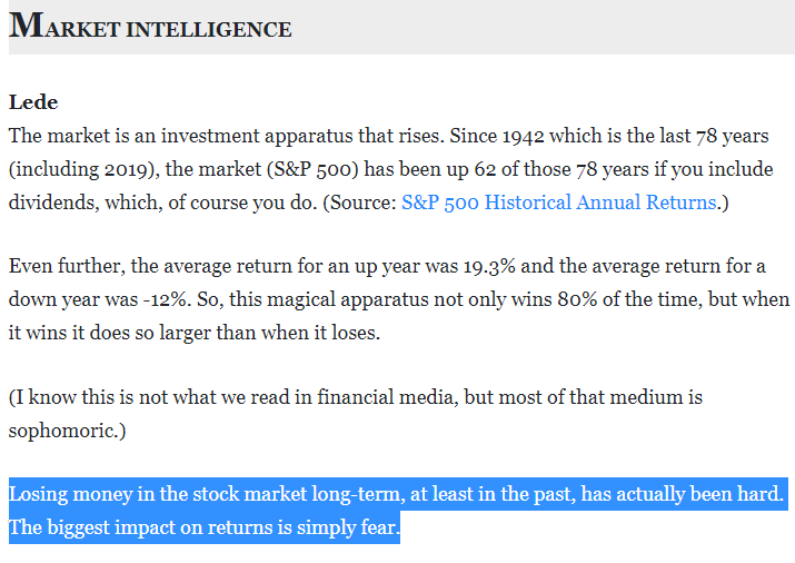 Since 1942, the market has been up about 4/5 years, and the up years (19% return) are larger than the down years (-12%).