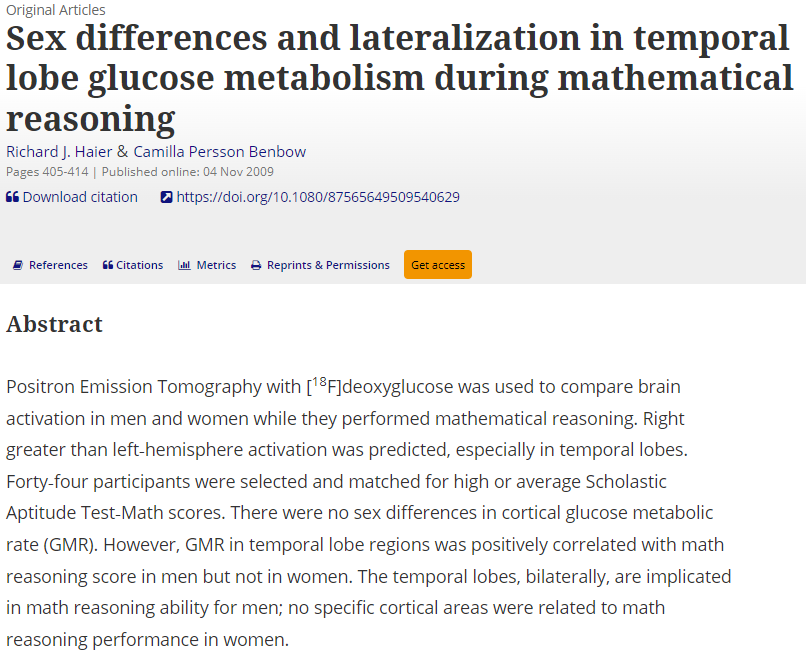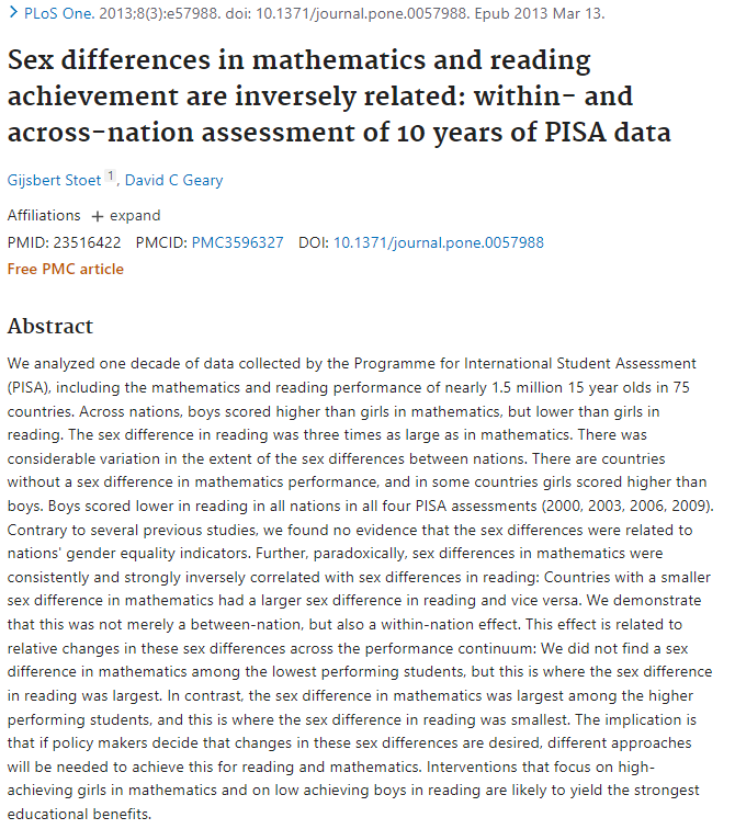 Una fuerte evidencia de esta diferencia entre varones y mujeres en razonamiento matemático (y otros, como lectura) fue dada por Gijsbert Stoet y David C Geary, quienes hicieron un análisis de la gigantesca base de datos de 10 años de pruebas PISA. pubmed.ncbi.nlm.nih.gov/23516422/