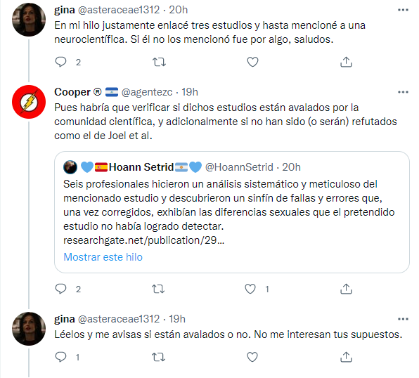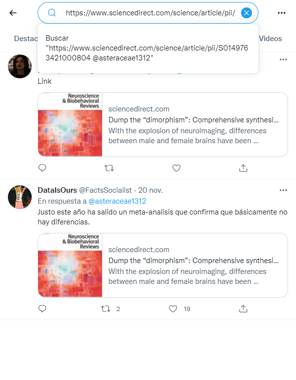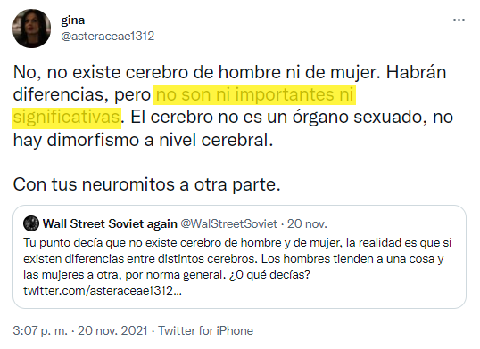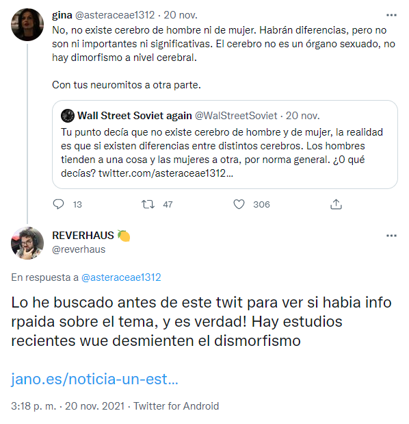 Y volviendo a la publicación de @asteraceae1312: si vamos a los comentarios, vemos que el usuario @reverhaus comparte un artículo que pretende resumir un estudio científico que habría "desmentido" el dimorfismo sexual cerebral.