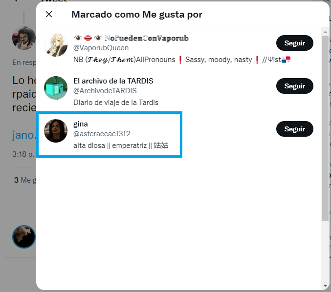 Poniendo en el buscador el enlace y el @ de su cuenta, y ordenando de más reciente a menos reciente, vemos que la primera vez que supo de ese estudio fue porque un usuario se lo mostró, y no porque Gina esté inmersa en el ámbito científico.