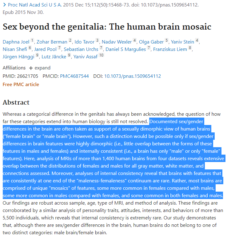 En este otro estudio neurocientífico, utilizando parámetros como la prevalencia de desórdenes neuropsiquiátricos como la depresión, los investigadores predijeron con un acierto del 100 % los sexos de una muestra completa de cerebros post-mortem. ncbi.nlm.nih.gov/pmc/articles/P…