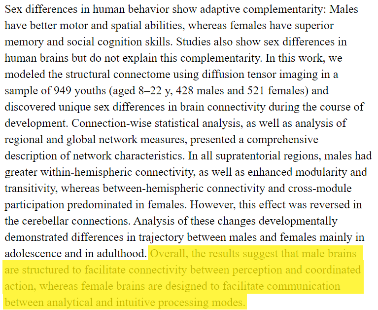 En este otro trabajo, por ejemplo, se analizan las diferencias sexuales en los conectomas cerebrales, mostrando que el cerebro del varón está mejor optimizado para la comunicación intrahemisférica, y el de la mujer para la comunicación interhemisférica. ncbi.nlm.nih.gov/pmc/articles/P…