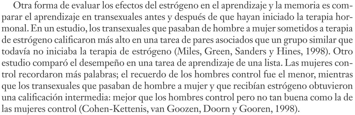 Los autores también analizan las evidencias sobre el impacto de las hormonas sexuales. Por ejemplo, explican cómo el estrógeno influye en un incremento de la capacidad de memoria, algo que incluso se analizó con transexuales hormonados.