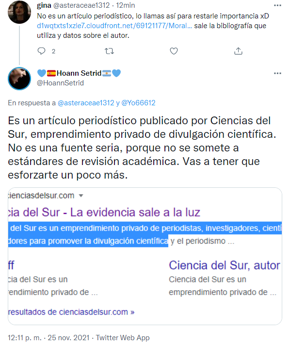 De hecho, la propia @asteraceae1312 ofreció su aval a dicho estudio poniéndole un ME GUSTA al comentario de @reverhaus donde ofrece la referencia a dicho estudio de Joel et. al.
